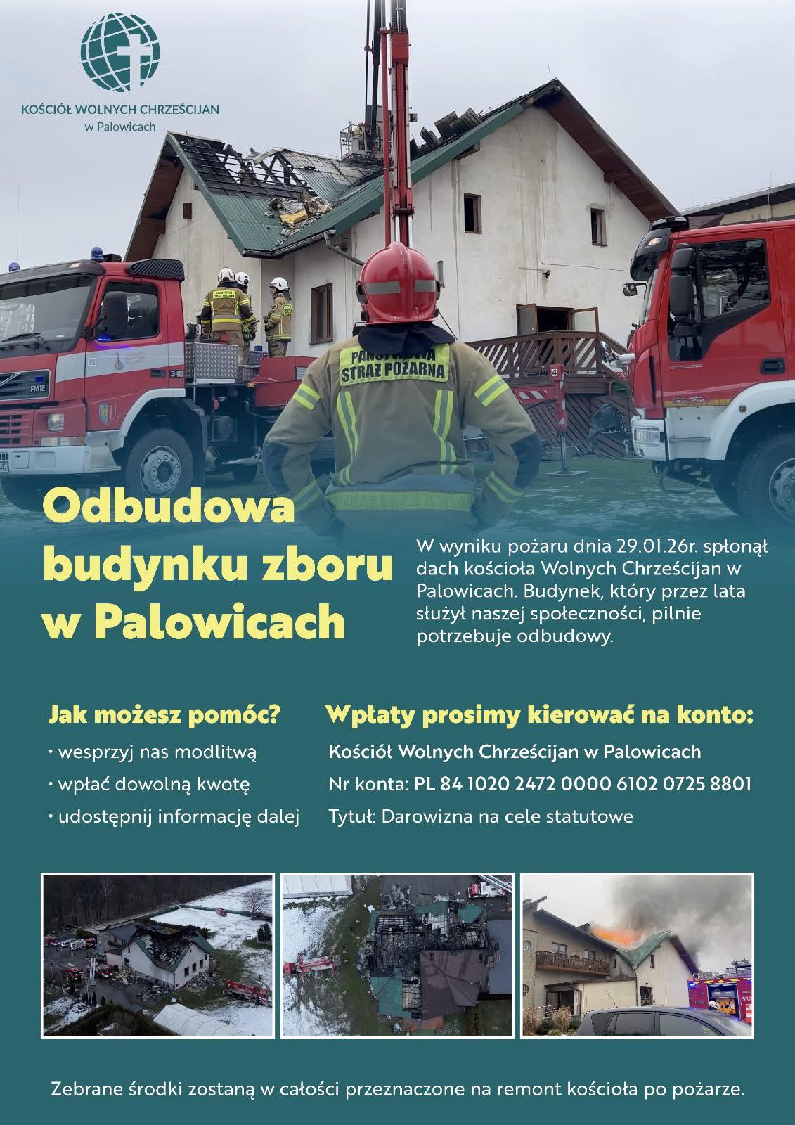 W sobotę, 29.01.2026 r. przed południem w wyniku pożaru poważnie ucierpiał budynek Zboru Kościoła Wolnych Chrześcijan w Palowicach (koło Rybnika i Żor na południu naszego kraju). Obraz zniszczeń obejrzeć można na filmie z akcji gaśniczej: https://youtu.be/jVqTkdbT4Lo